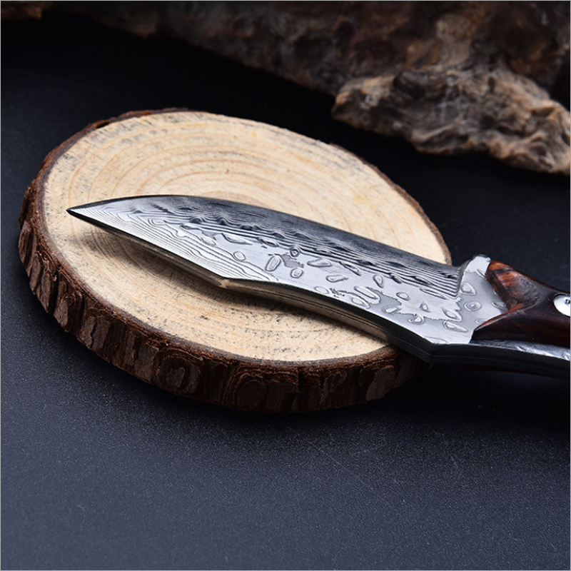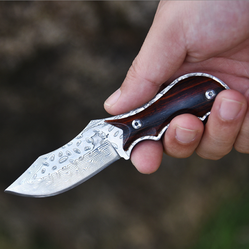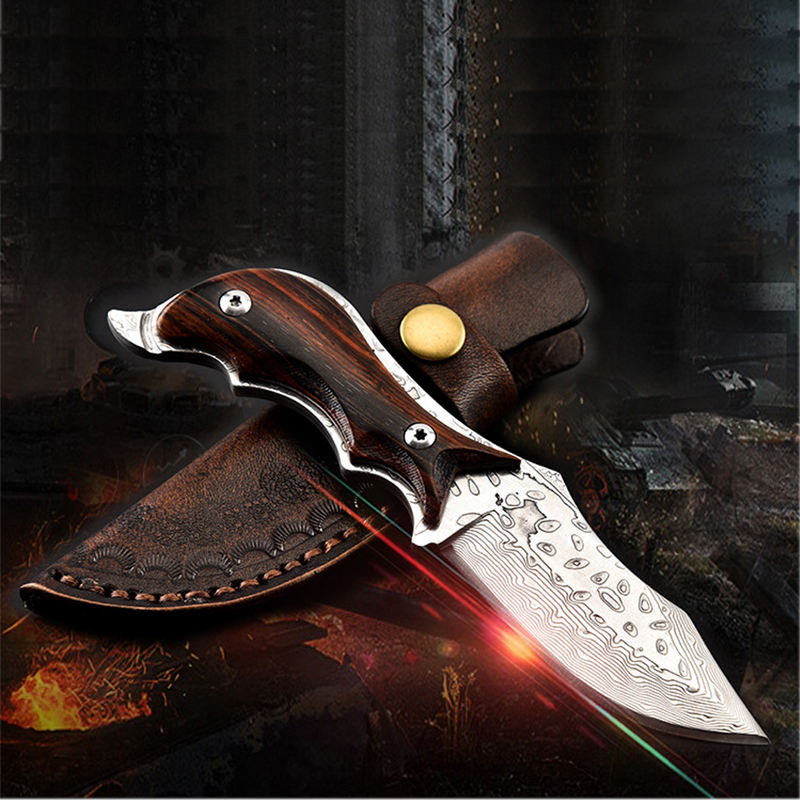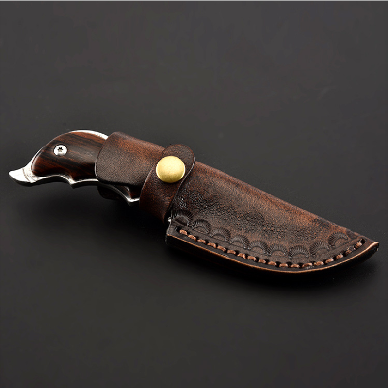 High class small size outdoor hunting damascus fixed blade knife in leather sheath