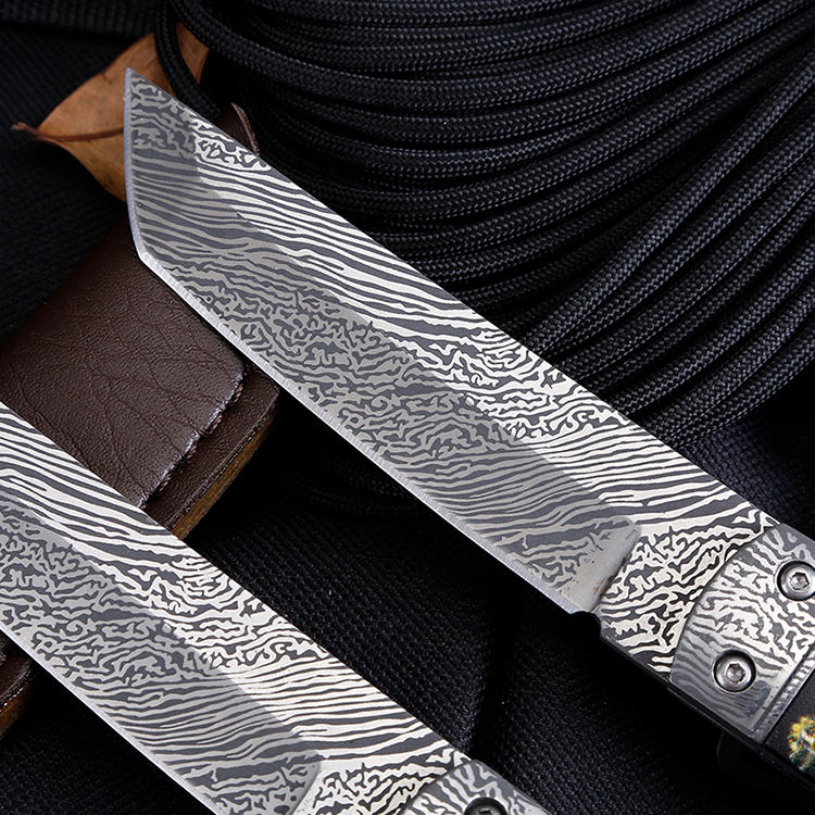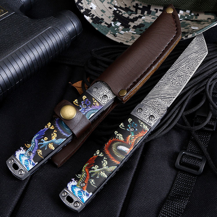 3D printing fixed blade outdoor camping knife with leather sheath full tang hunting tanto point blade laser engraved Damascus