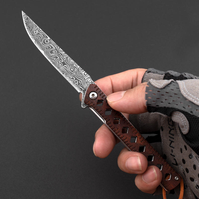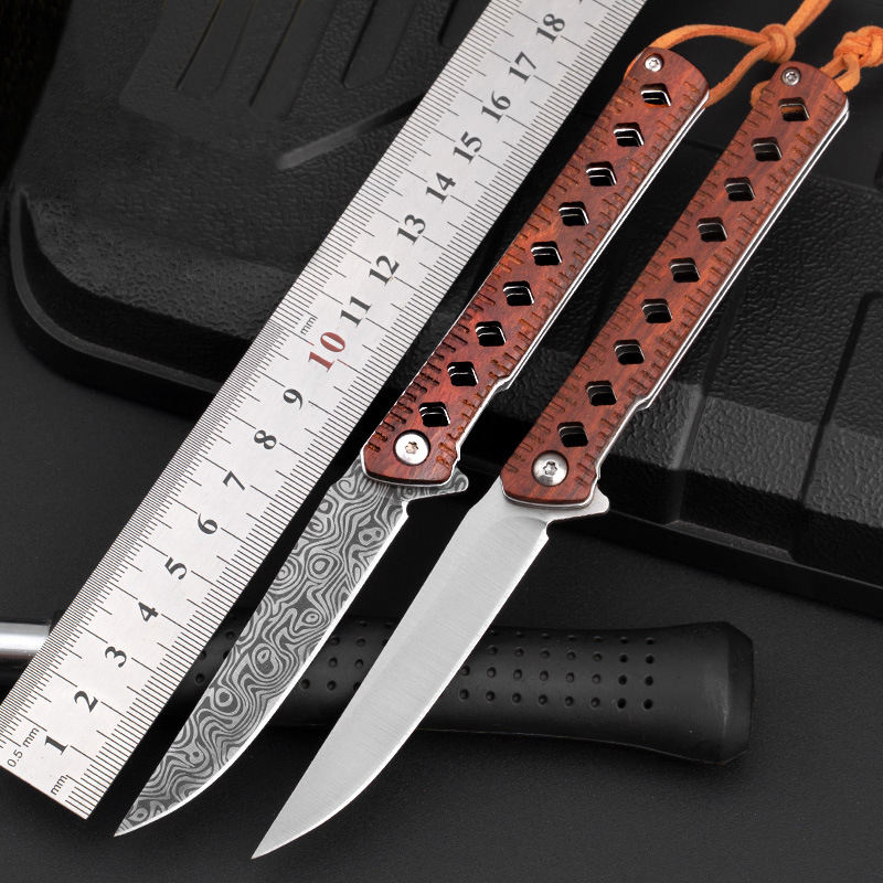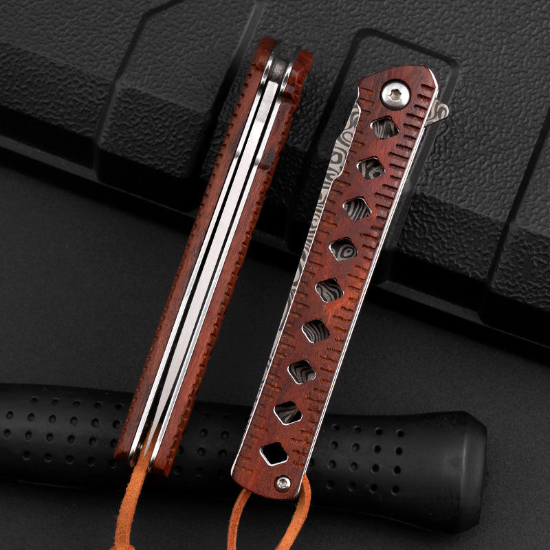 EDC Outdoor Laser Damascus Engraved Blade Wood Handle Self Defense Pocket Camping Survival Knife