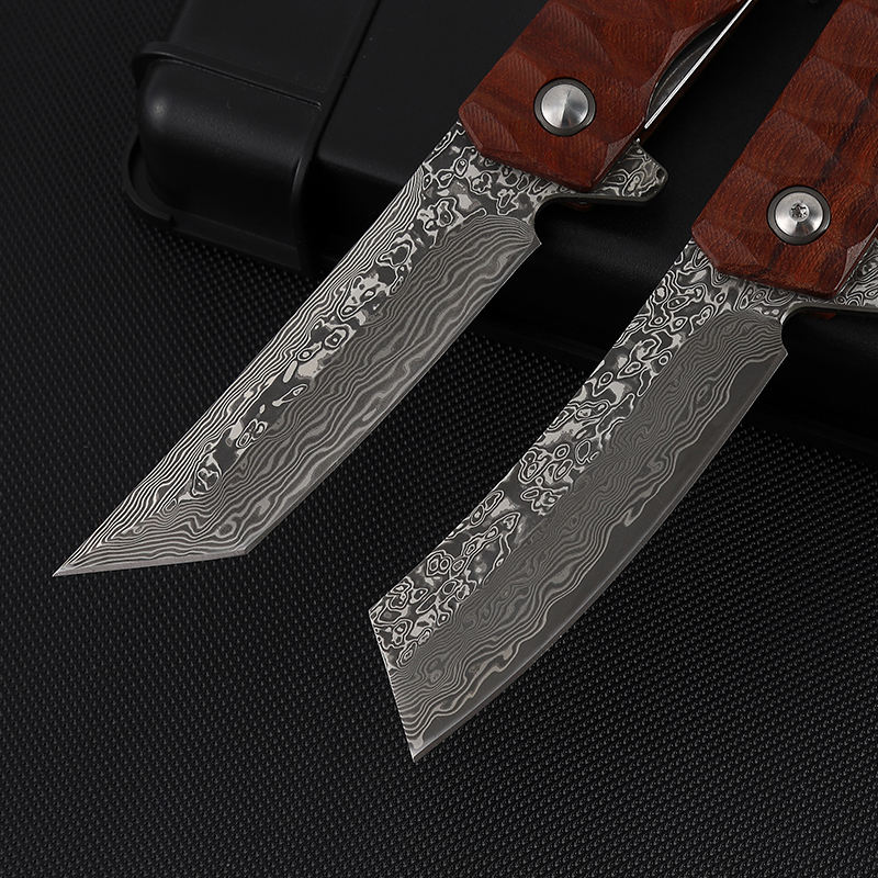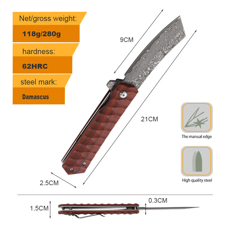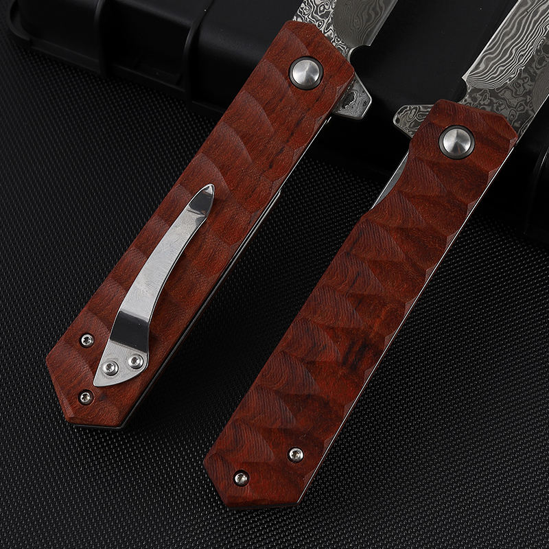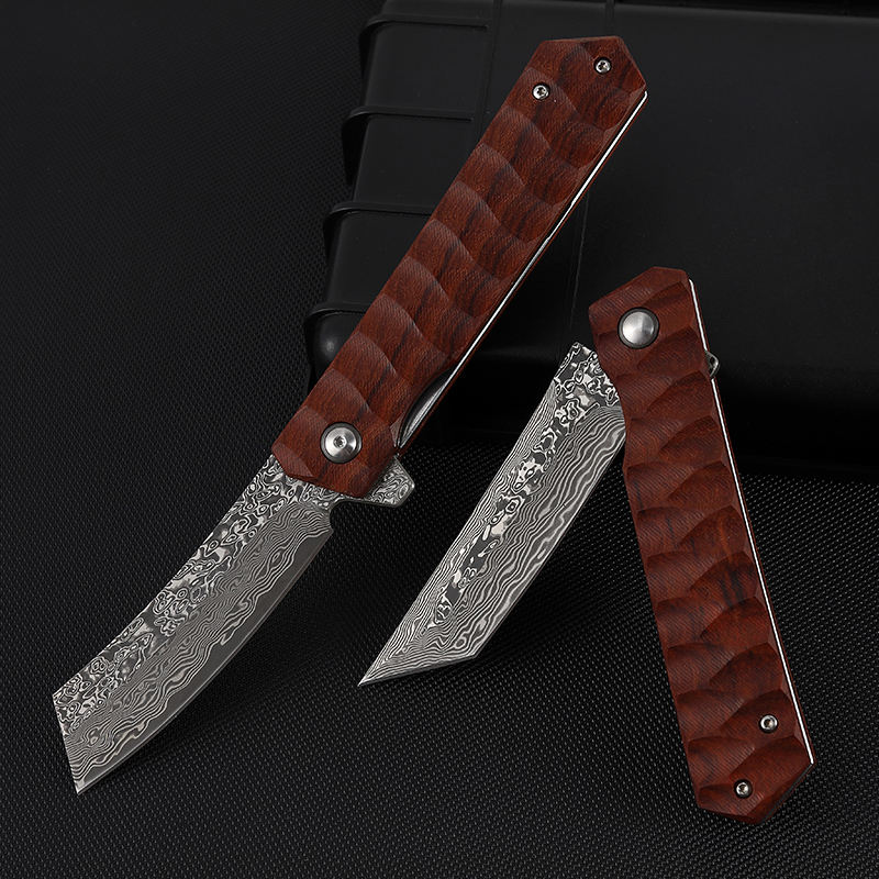 Excellent quality african rosewood jacket design damascus steel pocket folding knife with plate and tanto ponint