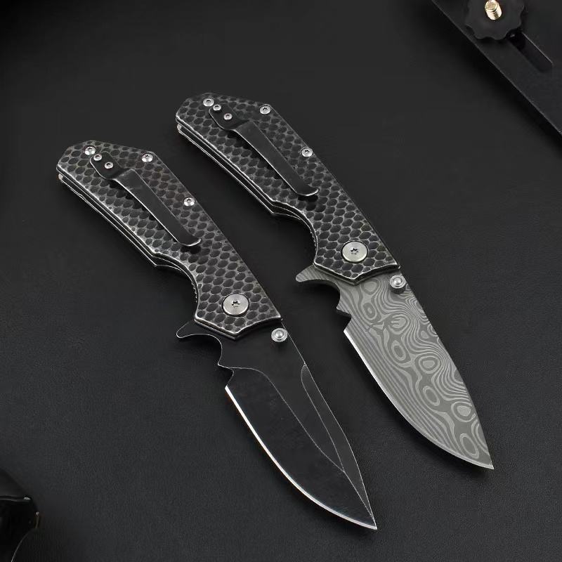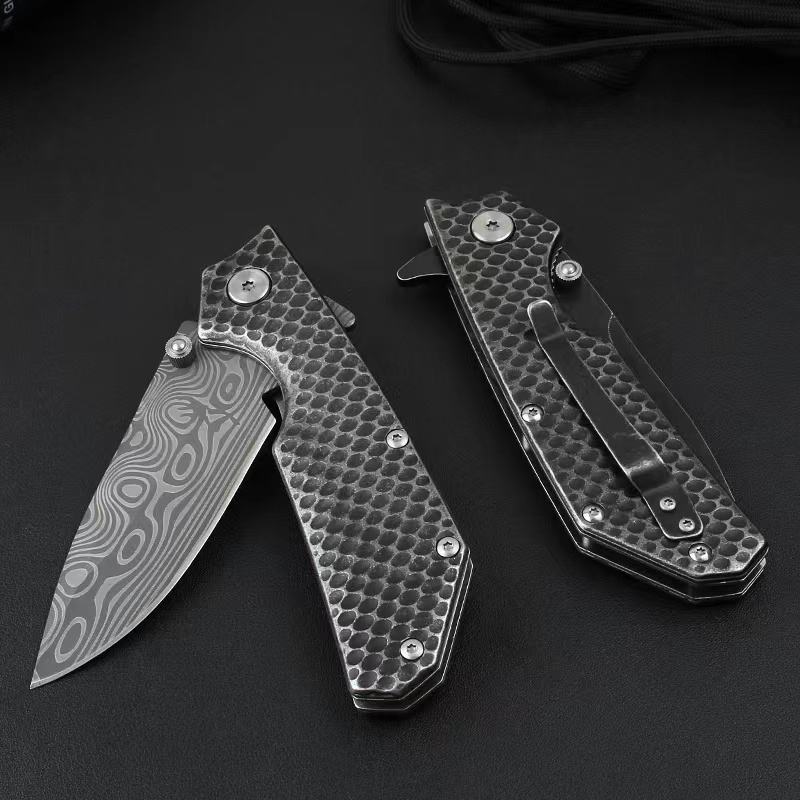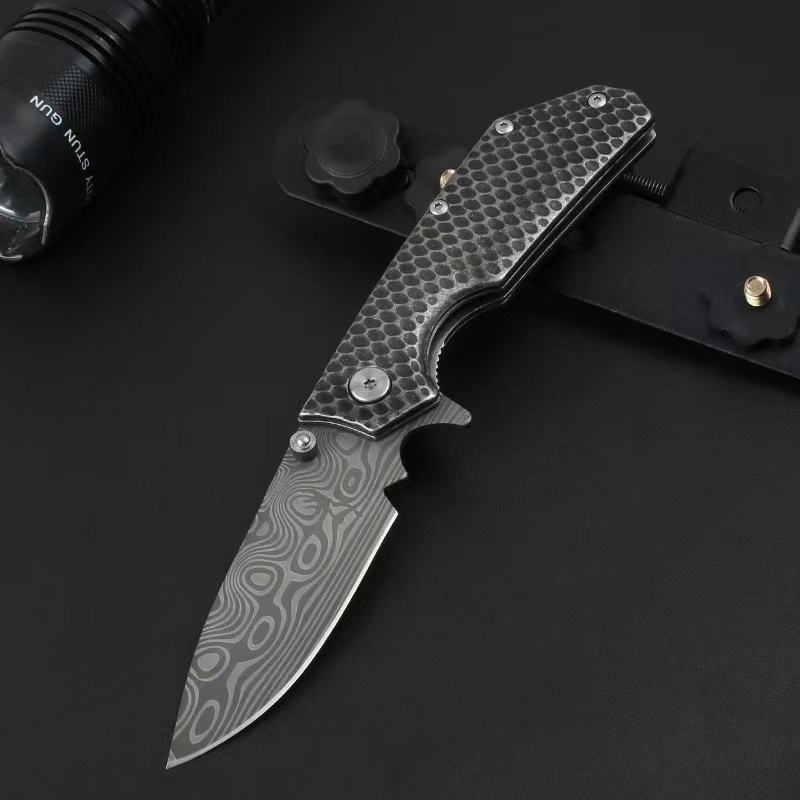 Black Coating 3Cr13Mov Steel Blade Folding Knife Print Damascus Pattern Survival Hunting Pocket Knife